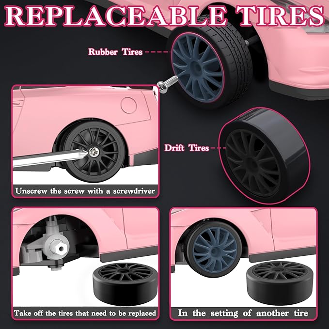 • Multi Function Toy: RC pink drift cars for girls is equipped with two types of tires, racing tires and drifting tires, which allows you to feel the different fun of racing and drifting. The two tires can easily switch to adapt to various scenes