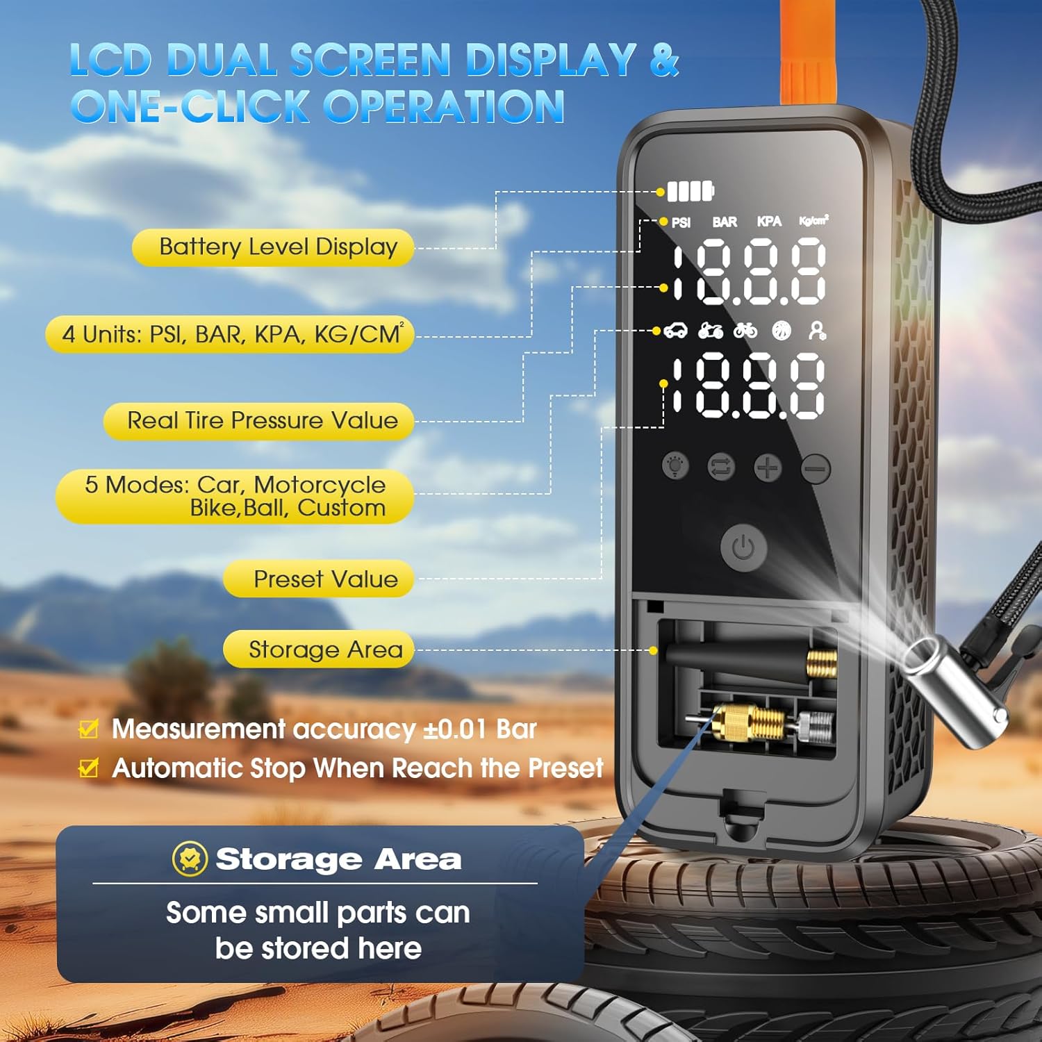 - [5+N Inflation Modes] The portable air compressor offers 5 preset inflation modes (Cars, Motorcycles, Bikes, Basketballs and Customization) and 3 preset units (PSI, KPA, BAR). The air pressure preset will automatically switch according to the change of inflation mode, easily set to your desired inflation mode.In addition, the extended 19.7-inch anti-scald and high-pressure hose can easily inflates from all angles and greatly improves the safety of inflation.