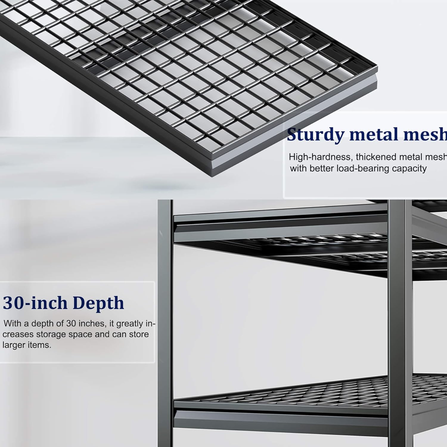 • 【Specially Designed Shelf 】This black heavy-duty shelving uses thickened steel, thickened panels, and a double-layered thickened column structure. The entire column requires no connectors, ensuring long-term durability.